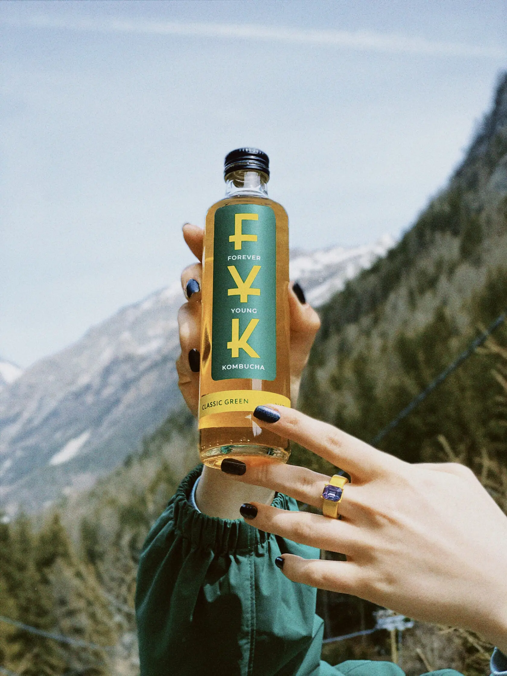 Zutaten: Aufguss aus grünem Tee (Wasser, grüner Tee), Apfelsaftkonzentrat, Matcha, Zucker, Kombucha-Kultur.