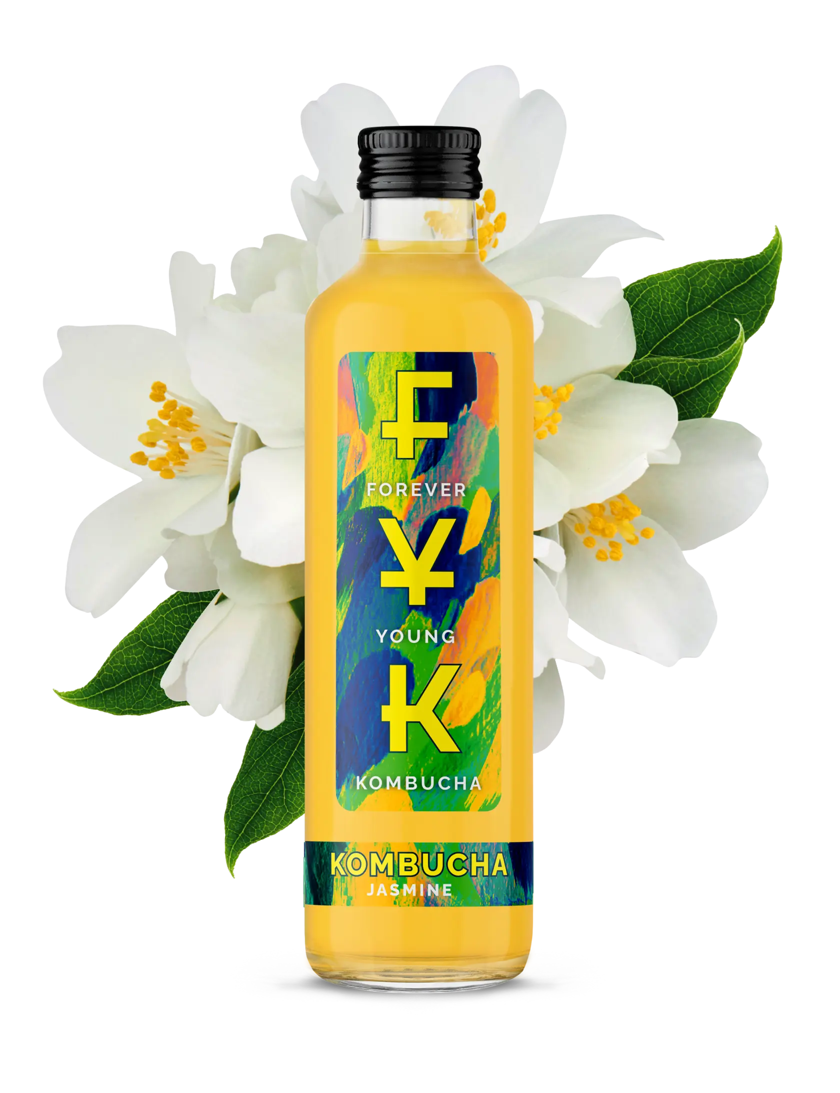 Natürliche Zutaten: gefiltertes Wasser, konzentrierter Apfelsaft (20%), grüner Tee, Jasminblüten, Zucker, Kombucha-Kultur.