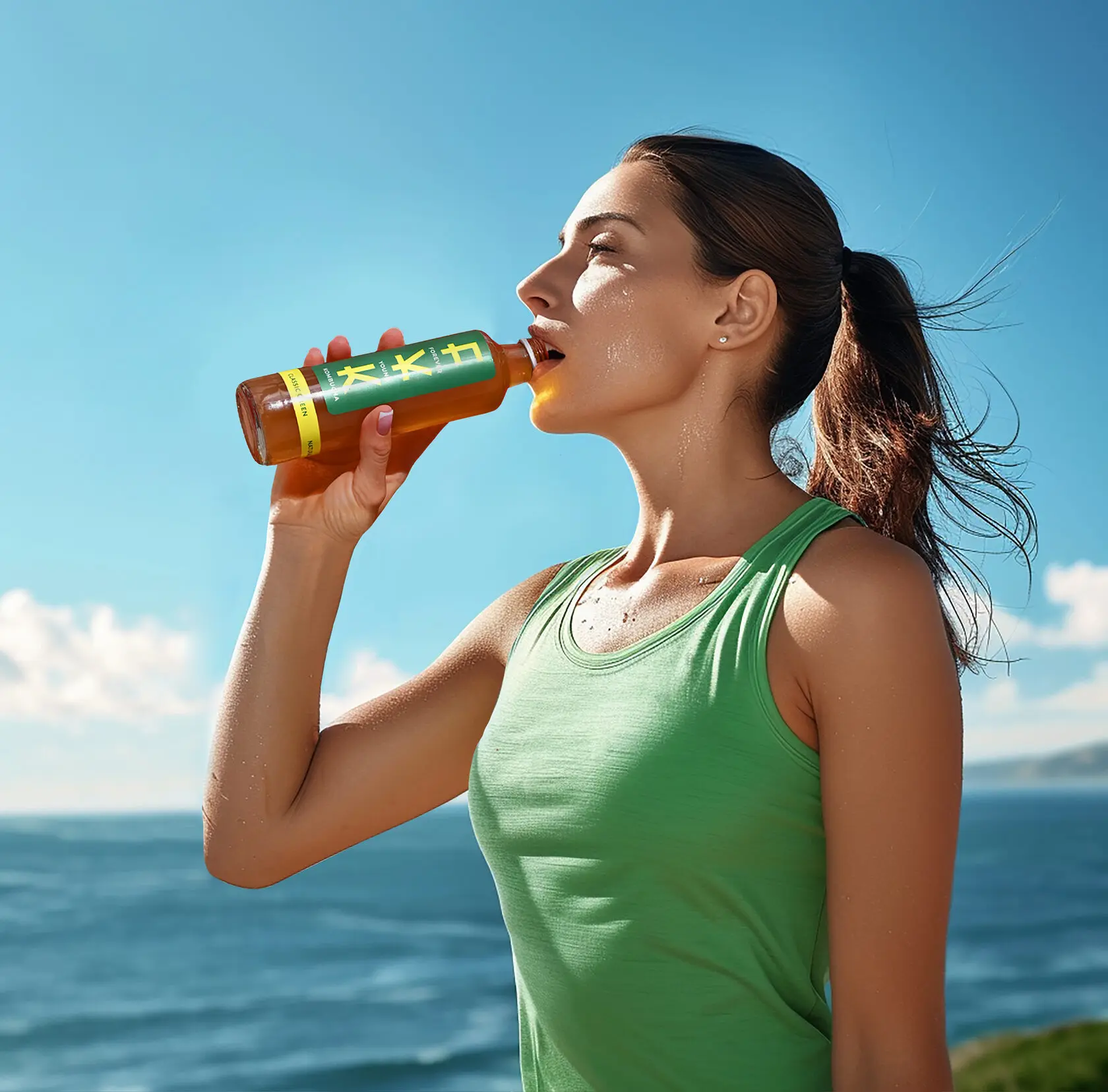 Zutaten: Aufguss aus grünem Tee (Wasser, grüner Tee), Apfelsaftkonzentrat, Matcha, Zucker, Kombucha-Kultur.